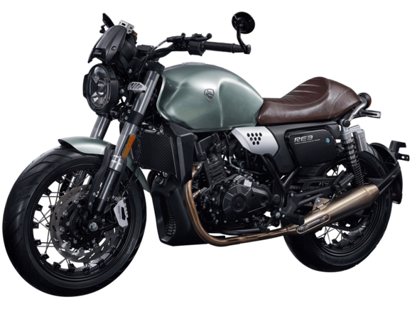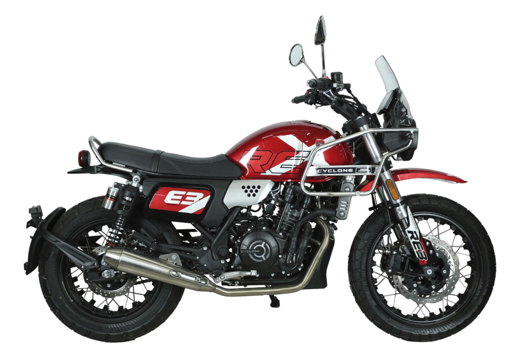 CYCLONE RE3 Scrambler (SR400-A) – универсальный мотоцикл, объединяющий в себе черты городского мотоцикла и эндуро. Управляя им, можно бросить вызов и городским пробкам, и скоростным автострадам, и всевозможному лёгкому бездорожью. Его дизайн отдаёт дань уважения каферейсерской тематике.Двухцилиндровый четырёхтактный двигатель объёмом 401 см3 выдаёт 43 л.с. на 9500 об/мин. Инжекторный впрыск топлива с инжектором BOSCH увеличивает топливную экономичность, а также позволяет добиться высокой приёмистости и неприхотливости агрегата. Жидкостная система охлаждения не допустит перегрева двигателя даже при самом агрессивном вождении. На мотоцикл установлена 6-ступенчатая механическая коробка передач.Максимальная скорость мотоцикла составляет 140 км/ч.Мотоцикл оснащён классическими спицованными колёсами диаметром 17 и 19 дюймов и имеет достаточно большой дорожный просвет – 22 см. С неровностями дороги эффективно справляются телескопическая вилка перевёрнутого типа спереди и маятник с двумя амортизаторами сзади. Ход передней подвески составляет 130 мм, задней – 81 мм. Оба компонента подвески являются регулируемыми. Эффективное и безопасное замедление с любых скоростей обеспечивают гидравлические дисковые тормоза с ABS спереди и сзади.Клиренс мотоцикла составляет 220 мм. Объём топливного бака – 19 л. Снаряжённая масса – 200 кг.На данной модели штатно установлены дуги безопасности, а также имеется бортовой компьютер с цветным дисплеем, USB-порт и подсветка пультов.RE3 Scrambler сочетает в себе отличные технические характеристики, комфорт и надёжность, что позволяет вам ощутить настоящую свободу на любой дороге с любым покрытием.