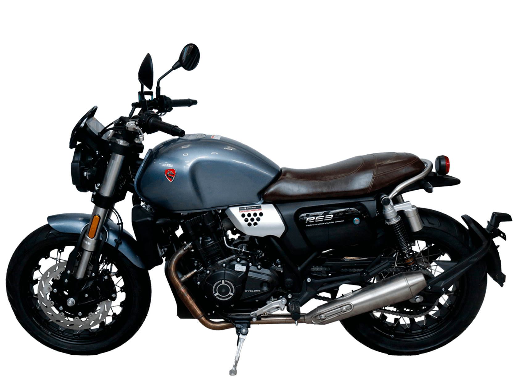 CYCLONE RE3 (SR400) – классик, в котором подчёркнутая простота объединяется с современными технологиями.Двухцилиндровый четырёхтактный двигатель объёмом 401 см3 выдаёт 43 л.с. на 9500 об/мин. Максимальный крутящий момент достигается на 8000 об/мин и составляет 34 Н·м. Инжекторный впрыск топлива с инжектором BOSCH увеличивает топливную экономичность, а также позволяет добиться высокой приёмистости и неприхотливости агрегата. Жидкостная система охлаждения не допустит перегрева двигателя даже при самом агрессивном вождении. На мотоцикл установлена 6-ступенчатая механическая коробка передач.Максимальная скорость мотоцикла составляет 140 км/ч.RE3 оснащён классическими спицованными колёсами диаметром 17 дюймов. Колёса обуты в бескамерные покрышки TIMSUN. С неровностями дороги эффективно справляются регулируемая телескопическая вилка перевёрнутого типа спереди и маятник с двумя амортизаторами сзади. Ход передней подвески составляет 110 мм, задней – 81 мм. Эффективное и безопасное замедление с любых скоростей обеспечивают гидравлические дисковые тормоза с ABS спереди и сзади.Клиренс мотоцикла составляет 145 мм. Объём топливного бака – 19 л. Снаряжённая масса – 186 кг.Из дополнительного оборудования можно выделить USB-порт, подсветку пультов и датчики давления в шинах.Мотоцикл сочетает в себе отличные технические характеристики, комфорт и надёжность, что позволяет вам ощутить настоящую свободу на любой дороге.