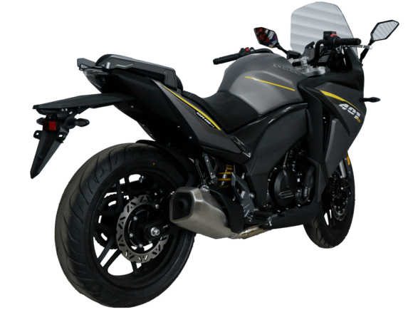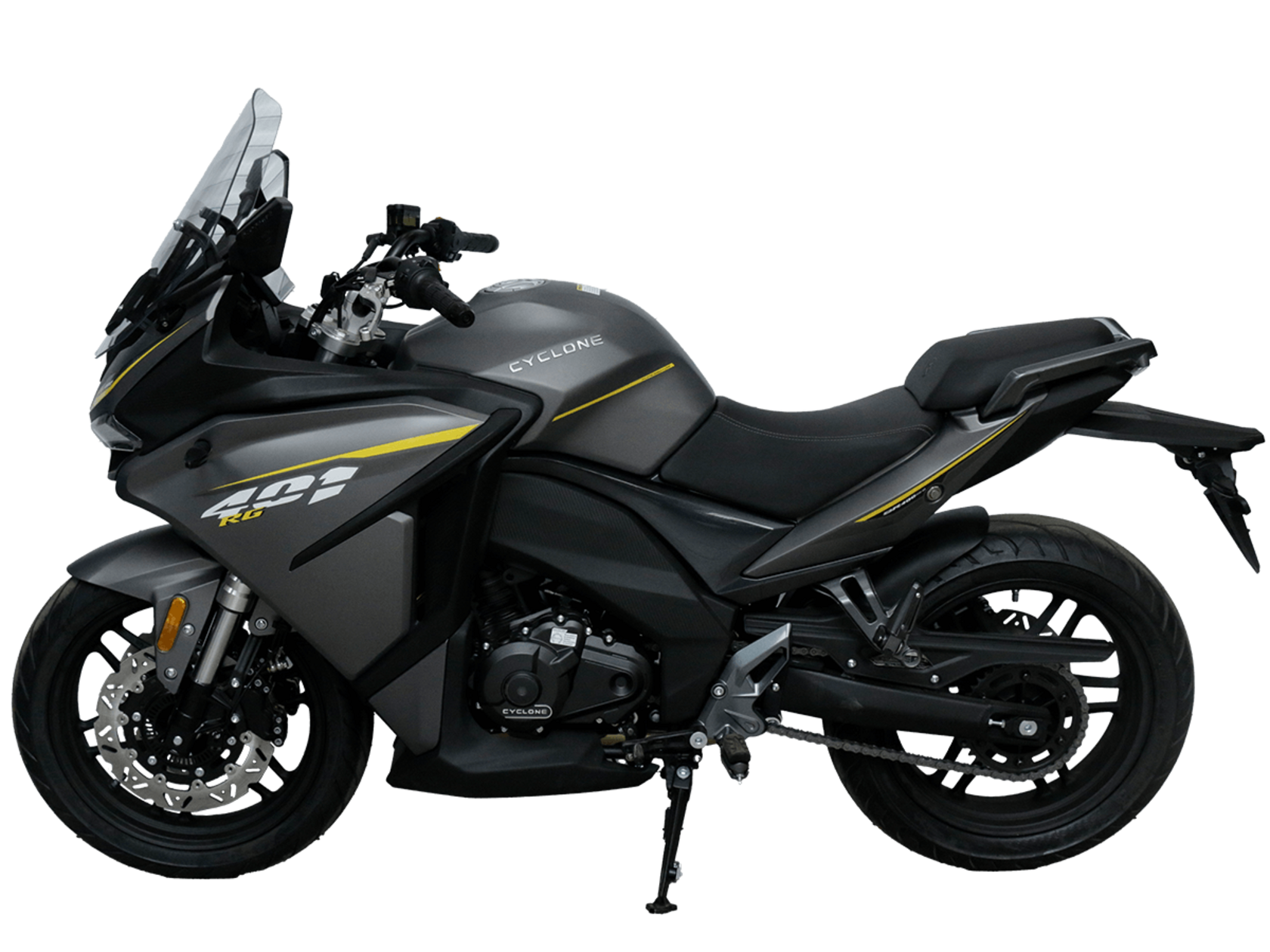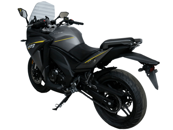 CYCLONE RG401 (SR400GS-B) – турист для покорения самых непростых и протяжённых маршрутов. Он обладает стремительным и современным дизайном в лучших “традициях жанра” туристических мотоциклов.Рядный двухцилиндровый четырёхтактный двигатель объёмом 401 см3 выдаёт 43 л.с. на 9500 об/мин. Максимальный крутящий момент достигается на 8000 об/мин и составляет 37 Н·м. Инжекторный впрыск топлива с блоком управления BOSCH увеличивает топливную экономичность, а также позволяет добиться высокой приёмистости и неприхотливости агрегата. Жидкостная система охлаждения не допустит перегрева двигателя а даже на самых непростых маршрутах. На мотоцикл установлена 6-ступенчатая механическая коробка передач.Максимальная скорость мотоцикла составляет 155 км/ч.RG401 оснащён литыми алюминиевыми дисками диаметром 17 дюймов. Колёса обуты в бескамерные покрышки TIMSUN. С неровностями дороги эффективно справляются телескопическая вилка перевёрнутого типа спереди и маятник с моноамортизатором сзади. Ход передней подвески составляет 120 мм, задней – 55 мм. Оба компонента подвески являются регулируемыми. Эффективное и безопасное замедление с любых скоростей обеспечивают гидравлические дисковые тормоза с двухканальной системой ABS спереди и сзади.Клиренс мотоцикла составляет 155 мм. Объём топливного бака – 21 л. Снаряжённая масса – 213 кг.Модель имеет два видеорегистратора, механическую регулировку ветрового стекла, датчики давления в шинах, подсветку пультов и два USB-порта. При желании можно оснастить мотоцикл двумя боковыми кофрами.Мотоцикл сочетает в себе отличные технические характеристики, комфорт и надёжность, что позволяет вам ощутить настоящую свободу на любой дороге.