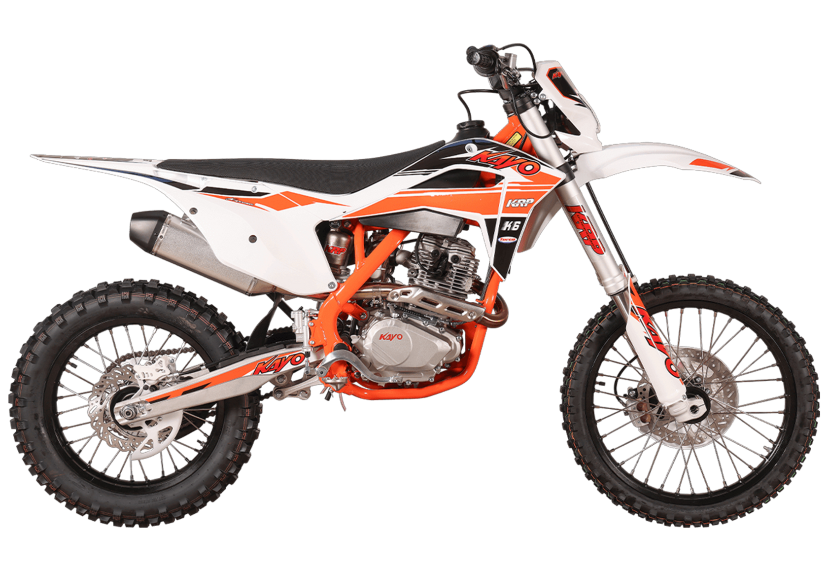 KAYO K6-A 300 MX – новинка в линейке эндуро мотоциклов. Это первый полноразмерный эндуро семейства KAYO с воздушным охлаждением. Создан для тех, кто ищет неприхотливый и выносливый мотоцикл для экстремальных условий офф-роуда и горных трасс.Модель оснащена одноцилиндровым 4-тактным двигателем 175FMN CB300RL с 4 клапанами и балансирным валом объёмом 271 см³ и мощностью 27 л.с. Запуск осуществляется с помощью электростартера. Карбюратор NIBBI PWK34 отвечает за стабильную работу даже при высоких нагрузках. Чтобы контролировать время работы техники, приборная панель оснащена счётчиком моточасов. Механическая коробка передач имеет 5 ступеней.Ходовая часть включает переднюю подвеску KAYO Racing Performance (KRP), произведённую компанией KKE специально для KAYO, с ходом 940 мм и задний моноамортизатор с ходом 480 мм. Оба компонента оснащены полным набором регулировок. Это позволяет настроить мотоцикл под конкретные условия и стиль вождения, чтобы езда по неровностям была более плавной и устойчивой.Классические спицованные колёса с алюминиевыми дисками и шины YUANXING диаметром 18 и 21 дюйм создают крепкий зацеп с поверхностью. Передние и задние дисковые тормоза гарантируют безопасность и контроль над скоростью. Пластиковая защита тормозных дисков повышает долговечность системы.Благодаря передней LED-фаре управление становится возможным даже в тёмное время суток.KAYO K6-A 300 MX – выбор тех, кому нужен производительный, лёгкий в обслуживании и надёжный мотоцикл для активного отдыха и спорта. Подойдёт и новичкам, и опытным гонщикам.Комплектация и внешний вид мотоцикла могут отличаться в зависимости от поставки. Изображение на сайте не гарантирует наличие тех или иных опций. Уточняйте информацию при оформлении заказа.