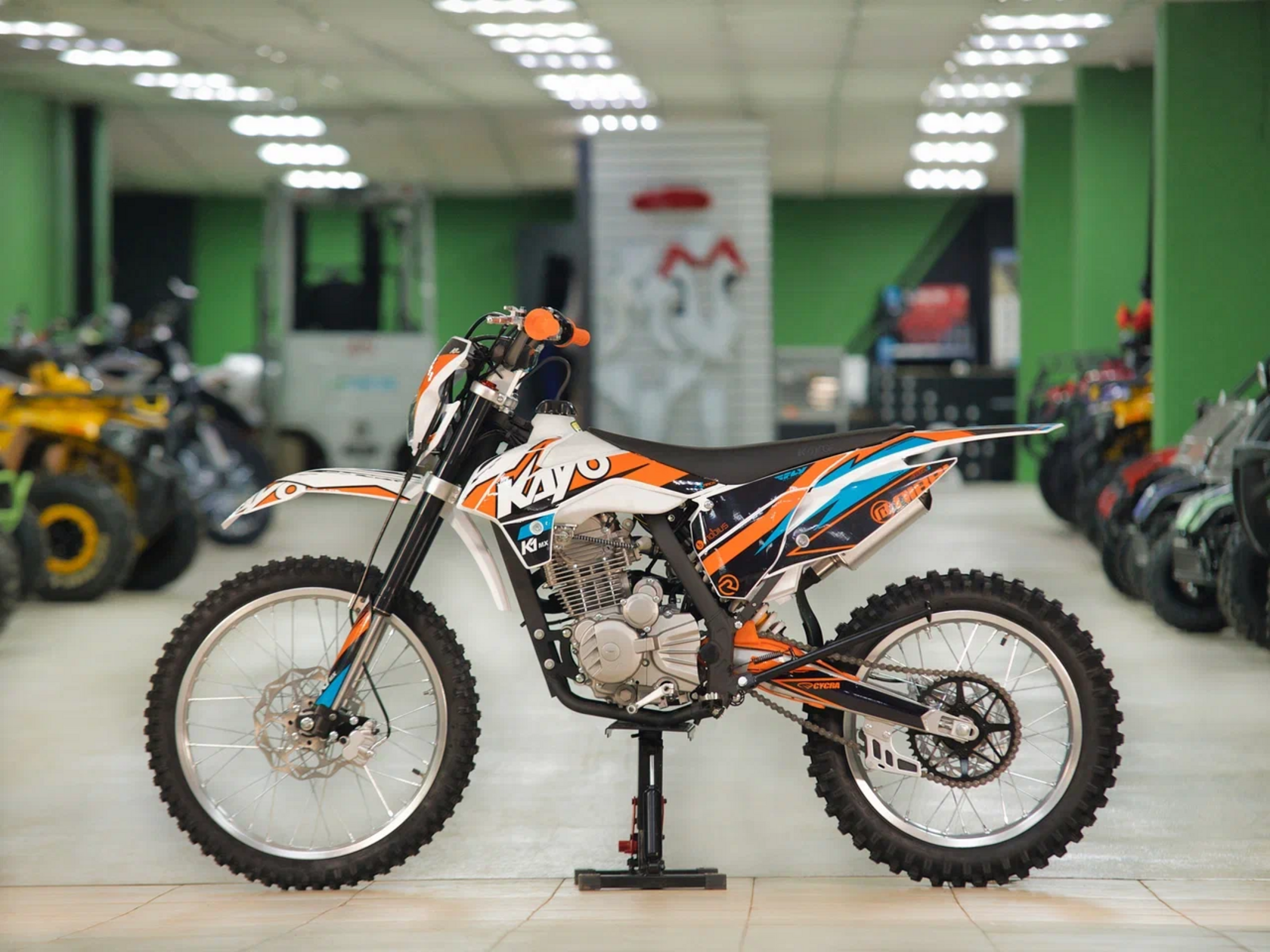 Кроссовый мотоцикл KAYO K1 250 MX – “народная” версия внедорожного мотоцикла от компании KAYO. Идеальный снаряд для внедорожного экстрима, представляющий собой оптимальный баланс производительности и технической оснащённости, поэтому он идеально подходит как новичкам, так и опытным райдерам. Удобный, простой и надёжный мотоцикл, который полностью оправдывает свою цену.Мотоцикл оснащён одноцилиндровым 4-тактным двигателем воздушного охлаждения (ZONGSHEN ZS172FMM) объёмом 249 см3, который обеспечивает высокую мощность (21 л.с.) и крутящий момент, что позволяет развивать большую скорость и с лёгкостью преодолевать трассы со сложным рельефом. Карбюраторная система подачи топлива с карбюратором NIBBI PE30 обеспечивает бесперебойную работу техники в самых жёстких условиях эксплуатации, простоту и лёгкость в обслуживании, а также неприхотливость к качеству топлива. Аппарат оснащён 5-ступенчатой механической коробкой передач с классической схемой “1-N-2-3-4-5”.Усиленная рама из хром-молибденового сплава и подвеска позволяют эффективно амортизировать удары при езде по неровностям и препятствиям на трассе. Передняя подвеска телескопическая вилка перевёрнутого типа от фирмы KKE длиной 800 мм, задняя — нерегулируемый моноамортизатор 360 мм, рассчитанный на высокие нагрузки до 900 LBS, также произведённый компанией KKE. Мотоцикл оснащён классическими спицованными колёсами диаметром 18 и 21 дюйм. Колёса имеют усиленные обода из алюминиевого сплава и буксаторы. Эффективное и безопасное замедление с любых скоростей обеспечивают гидравлические дисковые тормоза.Мотоцикл достаточно компактен и имеет вес всего в 105 кг, поэтому он комфортен в эксплуатации одновременно и для мужчин среднего телосложения, и для девушек. Аппарат оснащён системой запуска двигателя при помощи кнопки электростартера или при помощи рычага кик-стартера.Высококачественная износостойкая резина с развитым протектором отлично держит дорогу на различных типах покрытия и в самых разных поворотах. Сиденье эргономичной формы покрыто антискользящим материалом.K1 250 MX сочетает в себе отличные технические характеристики, комфорт и надёжность, что позволяет вам ощутить настоящую свободу на любой трассе