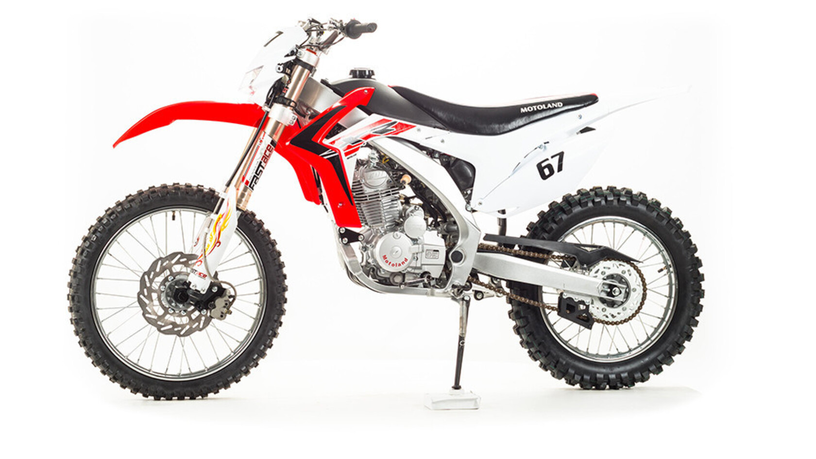 Обновленный мотоцикл Кросс 250см3 XR25FA ,это все тот-же мотоцикл только на данной модели установлены амортизаторы Fast Ace имеющая настройки сжатия и отбоя переднего и заднего амортизатора . Хорошее качество сборки и доступные цены на комплектующие позволяют поддерживать технику в исправном состоянии без больших затрат при любой интенсивности эксплуатации. Масса мотоцикла составляет порядка 120 кг. Габариты довольно большие – длина составляет 2000 мм., а высота по седлу – 920 мм., ширина руля- 830 мм. поэтому он отлично подойдет для тех, кто имеет рост от 175 см и выше.На мотоцикле установлен обычный для китайских кроссовых мотоциклов двигатель 169 FMM с 17 л.с. мощности, с воздушным охлаждением и рабочим объемом 230 кубов . Диаметр поршня движка составляет 65,5 мм, балансирный вал в конструкции не предусмотрен. Коленвал у мотоцикла Motoland XR 250 имеет палец диаметром 15 мм. Новые партии оснащаются карбюраторами PZ 30 с ускорительным насосом. Для удобства запуска мотора предусмотрен электростартер.Рычаги сцепления и тормоза – обычные, не складные. Передний тормозной диск имеет размер 280 мм., а размер заднего диска составляет 250 мм. Данный мотоцикл комплектуется колесами размерами 18/21 дюймов, размер задней покрышки – 110/90-18, передней- 80/100-21. Установлена 520-я цепь, передняя (ведущая) звезда имеет 13 зубов, задняя (ведомая) – 41 зуб.Подвеска у данной модели имеет стандартную прогрессию, как у большинства «китайцев». Размеры сальников прогрессии – 32х17х4, размеры подшипников – NK 17/16. Если Вам крайне важна качественная подвеска у мотоцикла, вместо предыдущей модели стоит купить Motoland 250 XR Fast Ace. Единственное отличие между ними заключается именно в этой детали, однако оно вносит немало нового в поведение транспорта, переводя его из чисто любительского класса уже в более профессиональный. Подвеска Fast Ace гораздо мягче стандартной, поэтому она во много раз лучше преодолевает неровности. Наличие регулировок позволяет подстроить амортизаторы под индивидуальные предпочтения. Размеры передних амортизаторов Fast Ace составляет d48x51, заднего амортизатора на данной модели составляют 470 мм. Задний маятник мотоцикла тоже стандартный, металлический.У модели Motoland XR 250 руль имеет переменное сечение: в месте установки его размер составляет 28 мм, а на концах под грипсами – 22 мм. Перевернутая вилка позволяет легче преодолевать любые неровности на дороге даже новичкам.Мотоцикл оснащен фарой головного света, что является необходимым условием для езды в сумерках и темноте. Если он покажется Вам недостаточно ярким, вместо стандартной лампы можно установить LED освещение или Биксенон. Переключение света осуществляется ключом зажигания.