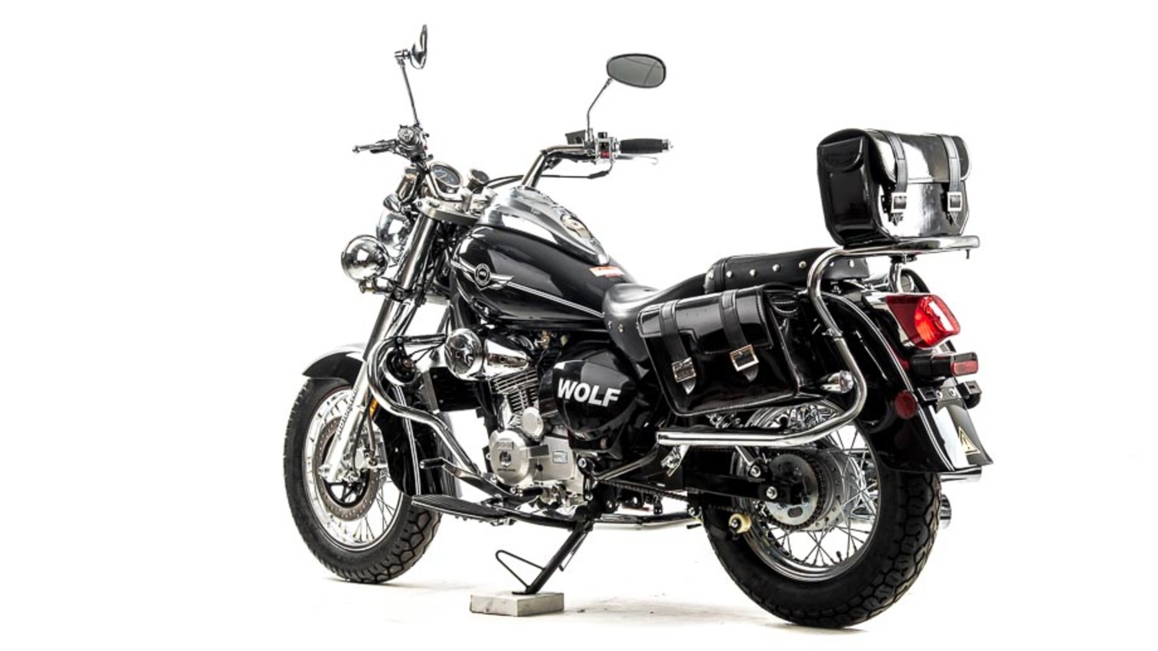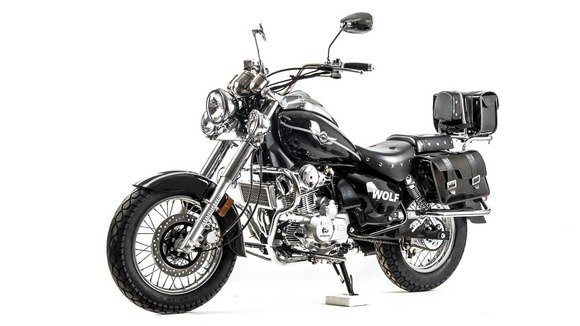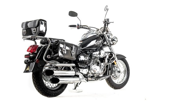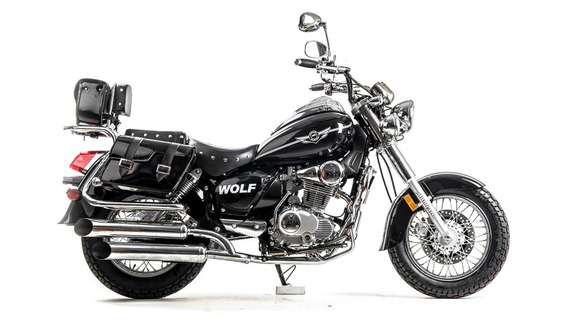 Дорожный мотоцикл MOTOLAND WOLF 250 - стильный и лаконичный дизайн способен порадовать глаз любого мужчины. Мощный движок и крутейшие технические характеристики - вот, что отличает его от собратьев. Этот байк просто создан для езды по городским джунглям!Чоппер WOLF 250 сразу привлекает внимание своим внешним видом. Выполнен в винтажно-классическом стиле с удлинённой рамой и передней вилкой, обилием хромированных элементов. Солидный, матово-чёрного цвета — этот чоппер выглядит значительно лучше своей ценовой категории.Мото чоппер весит 130 кг. Колёса спицованные, диаметр колёс — 16 дюймов (400 мм). Передний тормоз гидравлический дисковый с однопоршневым суппортом, прочно закреплён на 6 болтов. Тормозной шланг защищён специальным изолятором. Задний тормоз барабанный, легко регулируется даже в полевых условиях.Рама классическая, закольцованного типа. Вилка телескопическая, удлинённой формы, дополнительно защищена специальными металлическими кожухами. Есть нижние и верхние массивные траверсы. Руль сечения 22 мм с высоким подъёмом удобен для мотоциклистов разного роста. Зеркала заднего вида большие, с хорошим обзором. На ручках расположены кнопки дальнего и ближнего света, сигнал аварийной остановки, кнопки включения и выключения двигателя, блинкер, поворотники, звуковой сигнал. Также на руль вынесен подсос, что удобно при холодном запуске. Переднее и заднее крыло сделаны из прочного жёсткого пластика и близко прилегают к колёсам, подчёркивая городское и шоссейное назначение чоппера. На заднем крыле установлен стоп-сигнал и крепление для номера.Удлинённый руль и форма сиденья делают посадку максимально комфортной и позволяют держать спину прямо, снимая часть нагрузки с поясницы. Большое сиденье удобно для длительных поездок. Сиденье для пассажира оснащено специальной мягкой спинкой.Чоппер просто утопает в свете. На мотоцикл установлена большая фара ближнего и дальнего света, большие поворотники, светоотражатели. Такой чоппер невозможно не заметить даже в темноте или при плохой видимости.Купить мотоцикл чоппер стоит и за технические характеристики. Мото чоппер оснащён 4-тактным 1-цилиндровым двигателем с воздушным и маслорадиаторным охлаждением. Мотор мощностью 18 л. с. и объёмом 250 кубов разгоняет чоппер до 110 км/ч. Карбюратор с ускорительным насосом даёт хороший отклик на резкий старт и позволяет быстро набрать скорость. Расход топлива небольшой — 4 литра на 100 км. Трансмиссия механическая, включает 5 скоростей. Подножки удобные, дают возможность легко переключать передачи. Мотоцепь 420 защищена специальным кожухом. На чоппер установлены 2 выхлопные трубы.На панели приборов есть спидометр, индикаторы поворотников, индикатор нейтральной передачи, дальний свет. Здесь Вы можете получить всю информацию о состоянии мотоцикла: километраж, пробег, скорость, обороты двигателя.